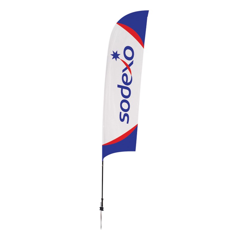 Make a bold statement with the 13' Streamline Razor Sail Sign Kit.. This sleek and aerodynamic sail sign stands at an impressive 13 feet tall, ensuring high visibility at events, trade shows, and outdoor promotions. Features: Uniform carbon composite overlay pole construction with high-gloss black paint finish Polished aluminum collar pole segment ends and ergonomic, rubber-reinforced base grip Carbon composite poles are strong and flexible Flag attaches to a fixed hook on the pole using the included bungee tie kit Ground spike is designed to be used in soil or on lawns Kit Includes: Graphic Banner, Base, Hardware, Carry Case, Bungee Kit Branded with the Sodexo 2 Color Logo Product Color: White, Red, & Royal