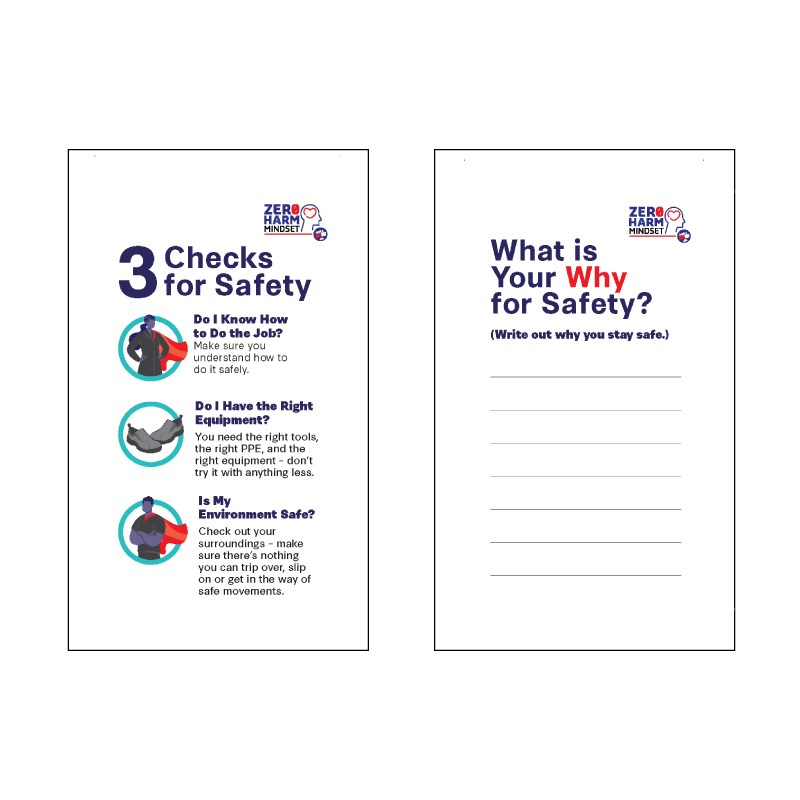 - Branded with the 3 checks for safety info on the front, and what is your why question on the back.