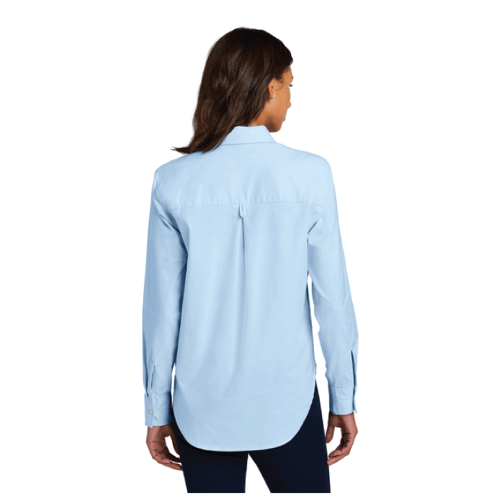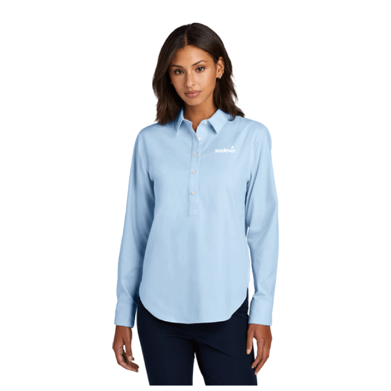 This modern oxford shirt blends crispness with casual flair, featuring a 4.1-ounce cotton/Lyocell/polyester/spandex blend for stretch. It has a popover design, pearlized buttons, drop shoulders, and a rounded hem with a slight drop, perfect for a confident corporate look.