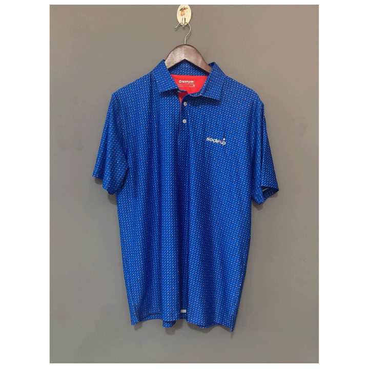 Our signature men's golf polos are made from high-performance, lightweight fabrics, offering a perfect blend of workwear and activewear. With a fun all-over print featuring your Sodexo brand colors and logos, these polos ensure comfort and style.
