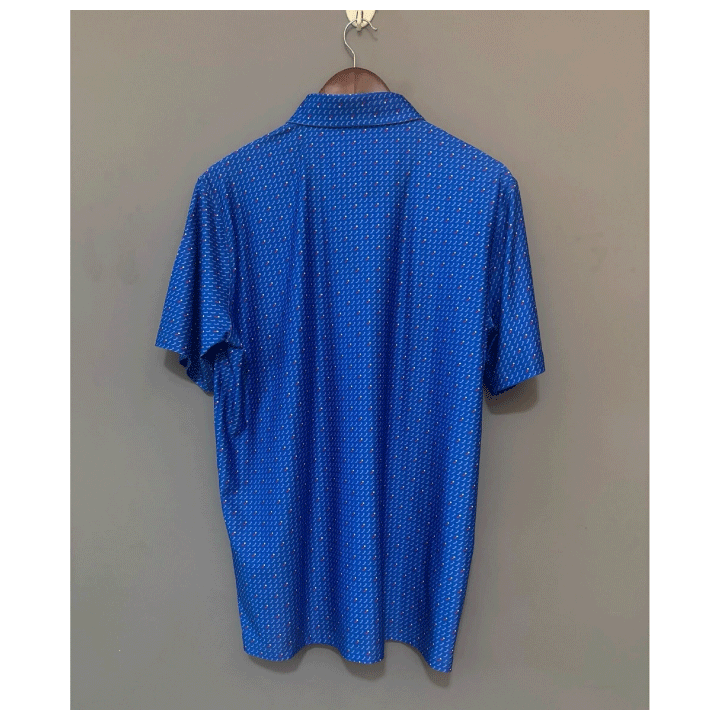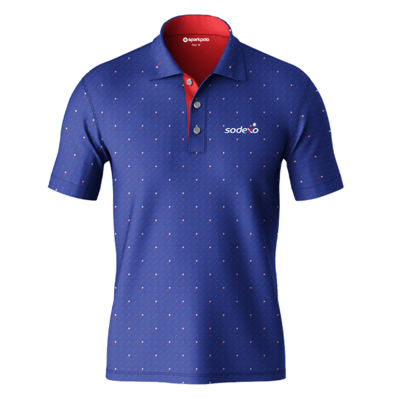 Our men's golf polos blend workwear and activewear with a fun all-over print of your Sodexo brand colors and logos. Made from lightweight, high-performance fabric, they offer comfort, style, and easy care. The fabric is 92% polyester and 8% elastane, with four-way stretch, moisture-wicking, and quick-dry properties. The polo features an anti-curl collar and a three-button placket.