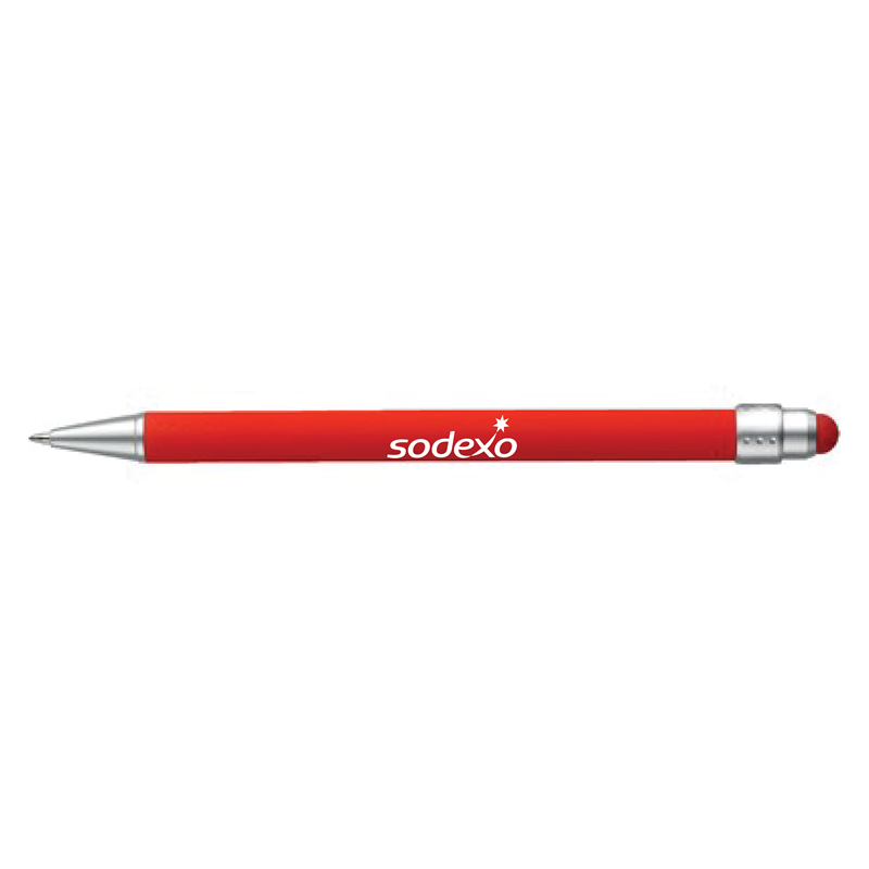 This retractable style has soft touch barrels with silver accents and matching stylus. Slide the clip down to use the pen - slide the clip down again to retract. Minimum order quantity is 10 pieces.